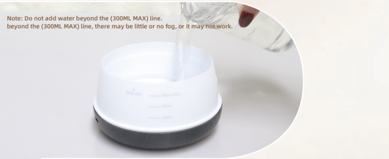 - Third: When using the remote control, aim the buttons on the diffuser to set it. Fill the water tank up to the ‘MAX’ line. Add 5-10 drops of essential oil to the water.