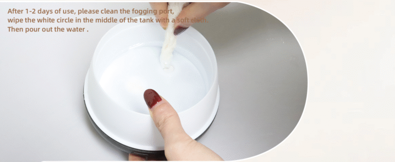 - To prevent damage, use room temperature distilled or filtered water. Stop use and refill when water runs out (it auto-shuts off, but avoid dry operation).