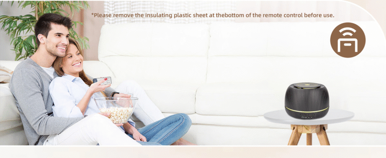 - Fourth: Turn on the diffuser and select the desired mist intensity and light color using the remote control. The diffuser will automatically shut off when the water runs out.