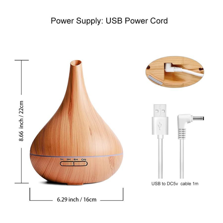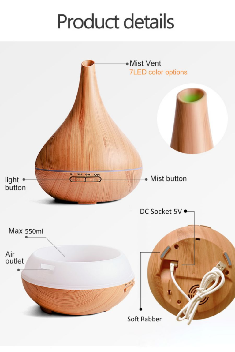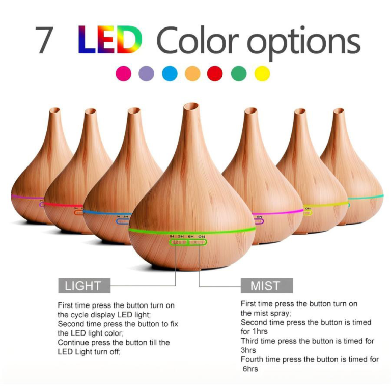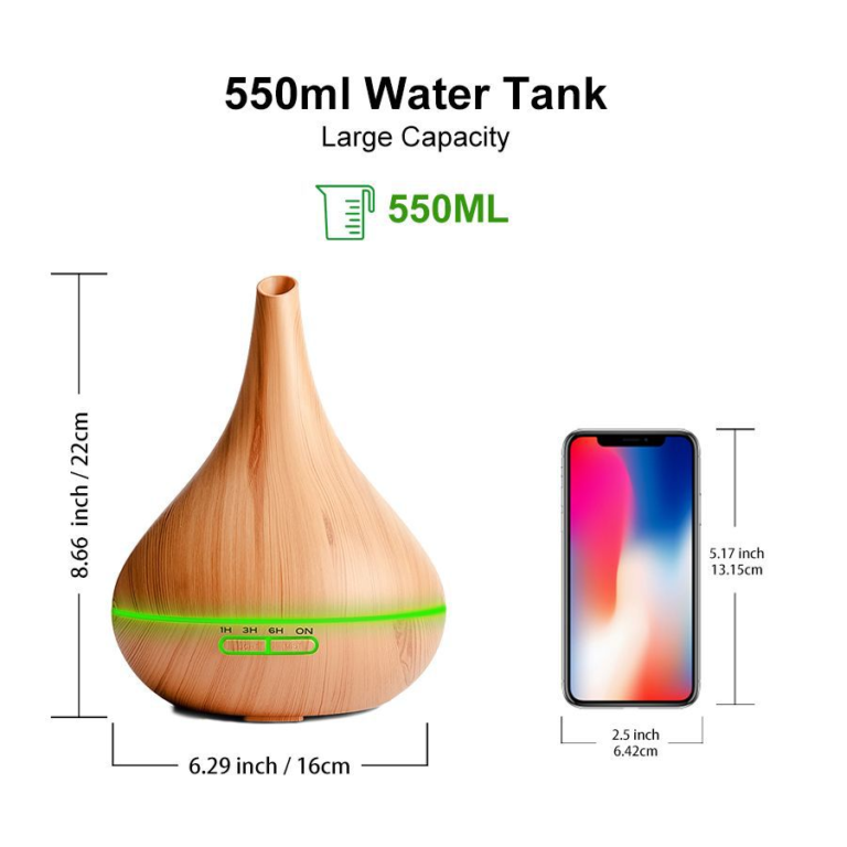 This 550ml wood-grain ultrasonic diffuser runs quietly (<36dB) for up to 10hrs, covering 21-40㎡. With 7-color LED night lights, auto shut-off, and easy cleaning, it humidifies, freshens air, and works with essential oils—perfect for home, office, or yoga!.