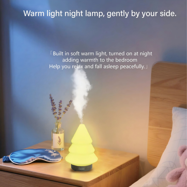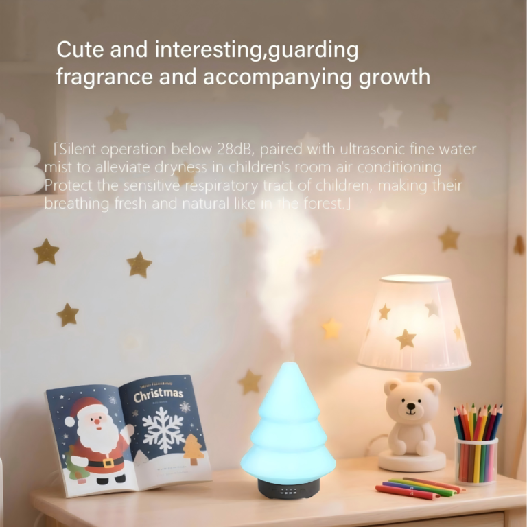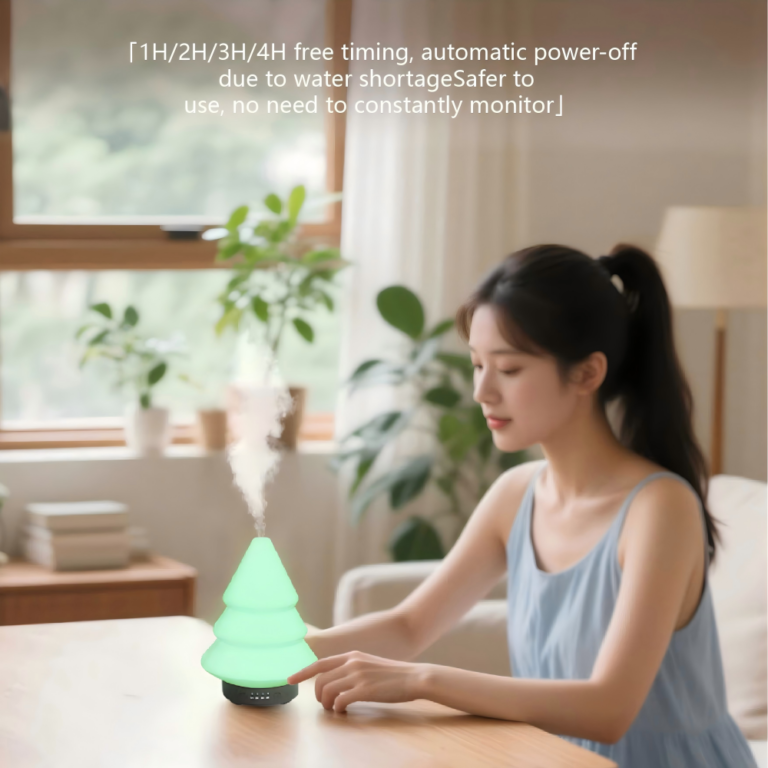 This Christmas Tree ultrasonic diffuser (101-200ml) offers humidification + aromatherapy. With 7-color LED lights, 1-4H timer, auto shut-off, and <36dB quiet operation—perfect for home, office, hotel, or holiday decor.